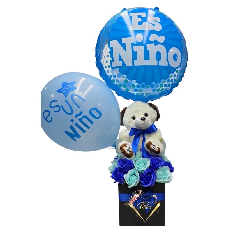 Arreglo de Nacimiento con Rosas Eternas, Peluche Perrito 20cm y Globos