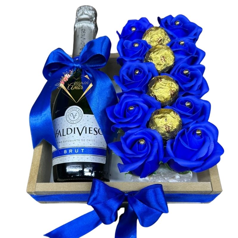 Base de Rosas Eternas Azules, Bombones y Espumante