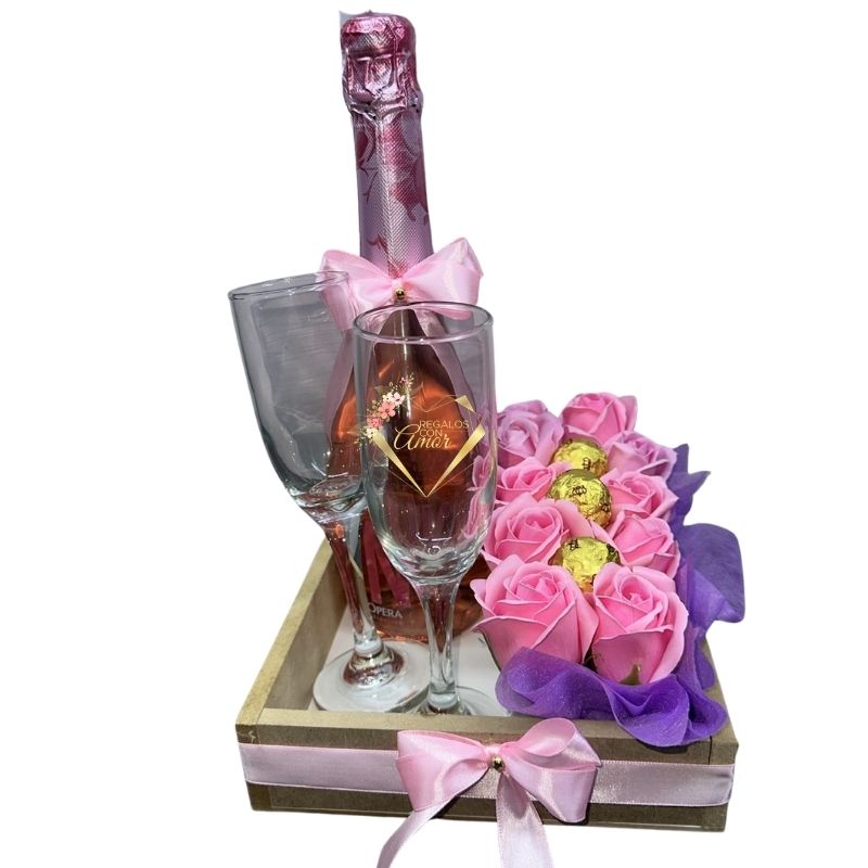 Base de Rosas Eternas, Bombones, Espumante y Copas