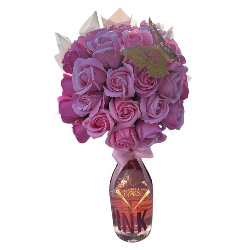 Botella con Bouquet de Rosas Eternas Rosadas