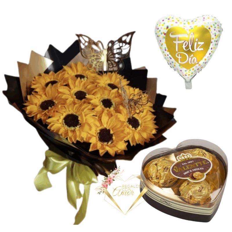 Bouquet de 10 Girasoles Eternos, Bombones Corazón y Globo
