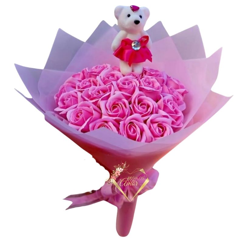 Bouquet de 25 Rosas Eternas Rosadas y Osito
