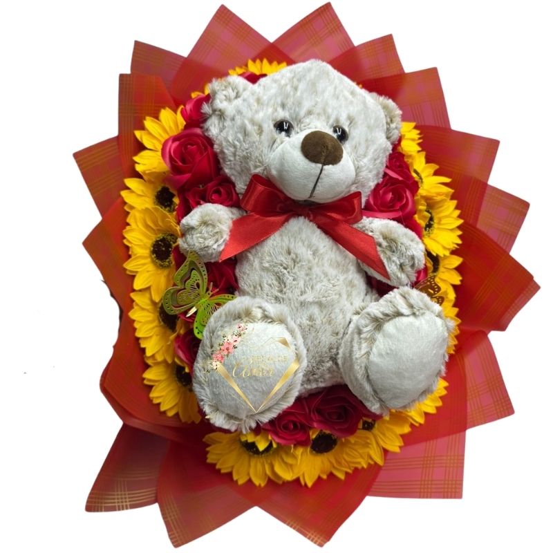 Bouquet de Girasoles y Rosas Eternas con Peluche de 28cm