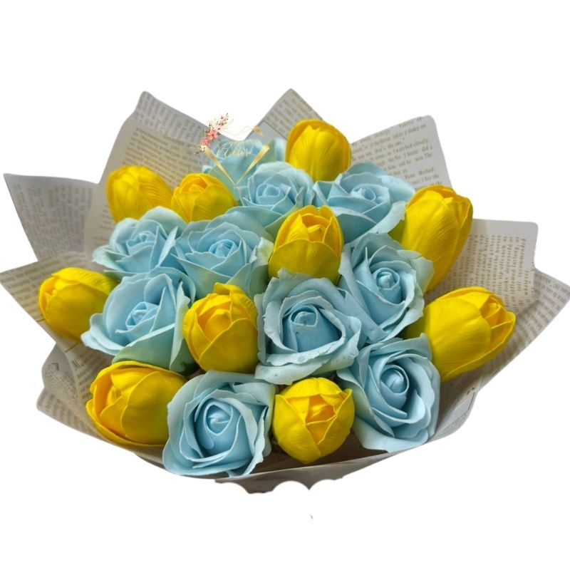 Bouquet de Rosas y Tulipanes Eternos Amarillo Celeste