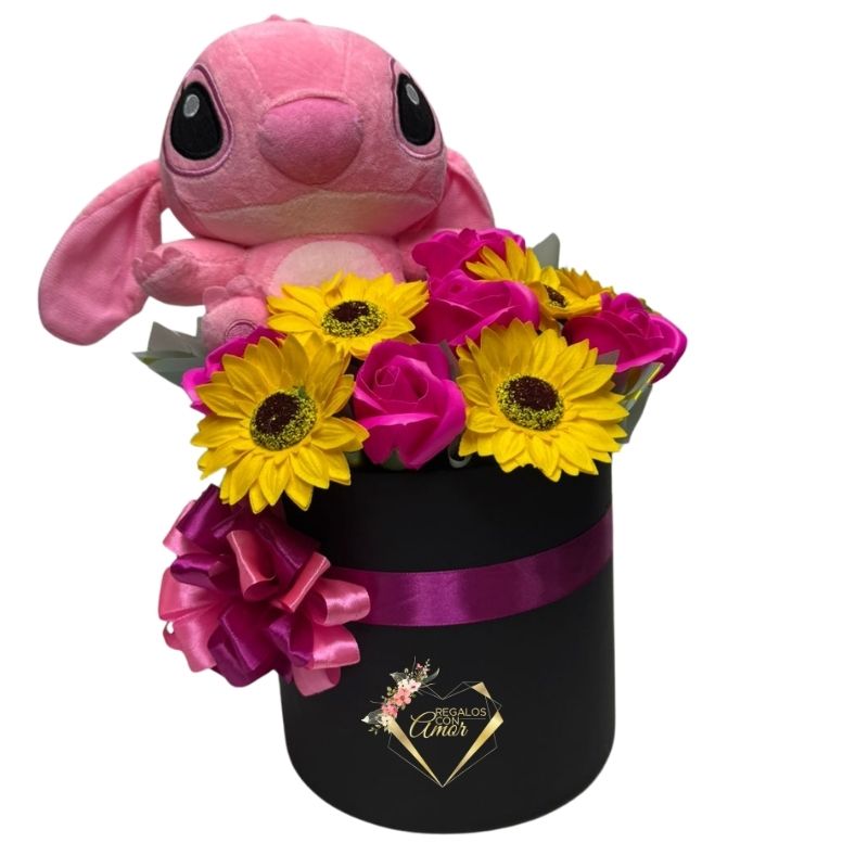 Box Cilindro con Flores Eternas y Peluche Angela