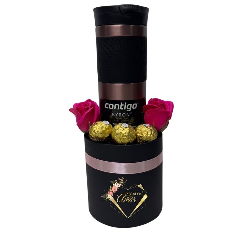 Box Cilindro con Vaso Térmico Contigo, Rosas Eternas y Bombones