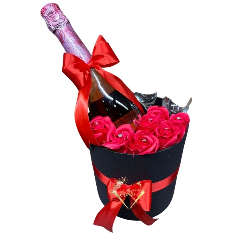 Box Cilindro de Rosas Eternas Rojas, Espumante Pink y Copas