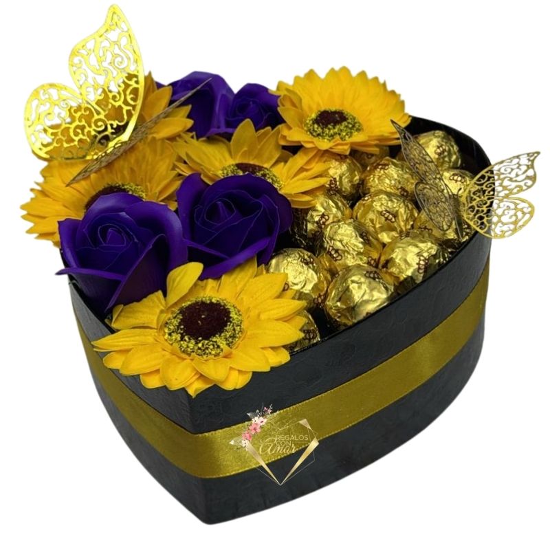 Box Corazón de Girasoles, Rosas Azules Eternas y 8 Bombones Valente