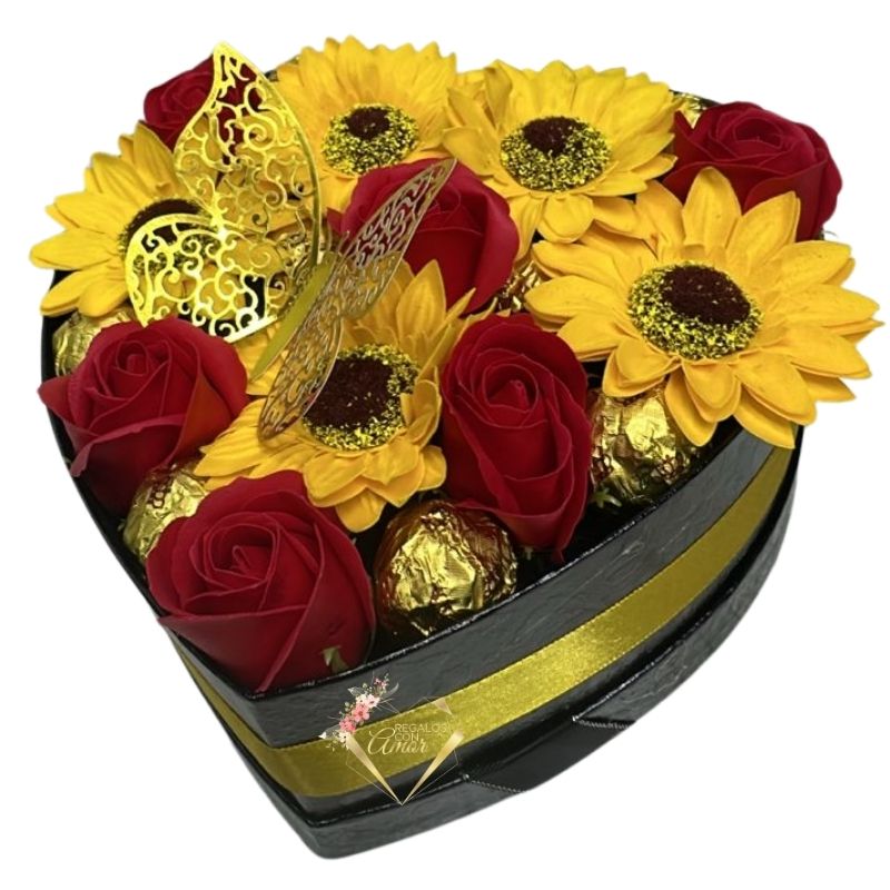 Box Corazón de Girasoles, Rosas Rojas Eternas y 6 Bombones Valente