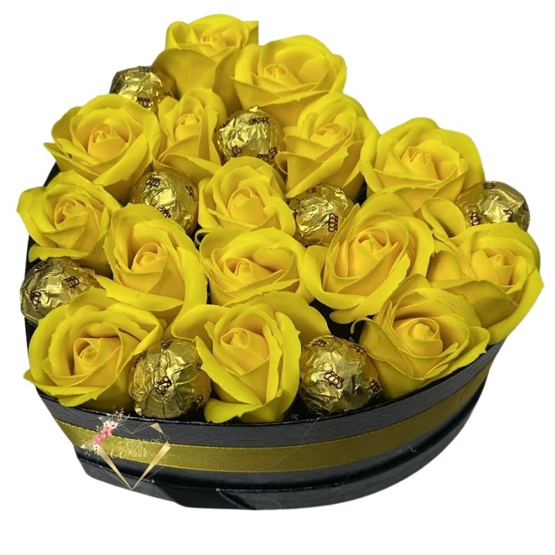 Box Corazón de Rosas 16 Eternas Amarillas y 8 Bombones Valente