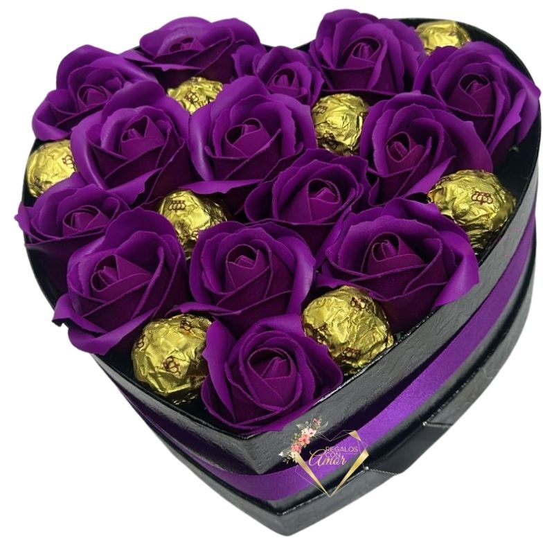 Box Corazón de Rosas 16 Eternas Moradas y 8 Bombones Valente