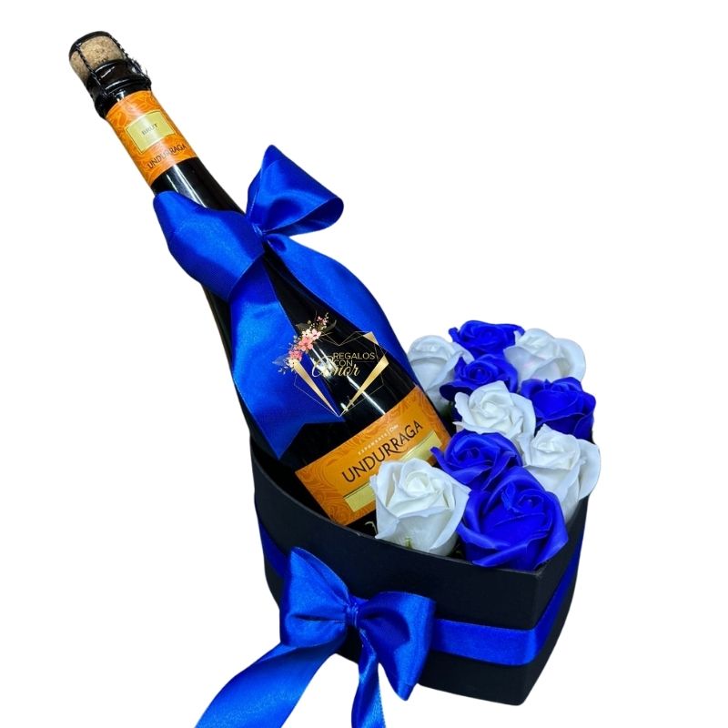 Box Corazón de Rosas Eternas Blancas y Azules y Espumante
