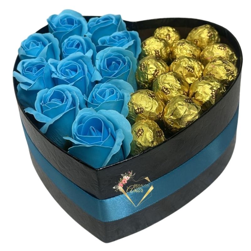 Box Corazón de Rosas Eternas Celeste mitad 12 Bombones Valente