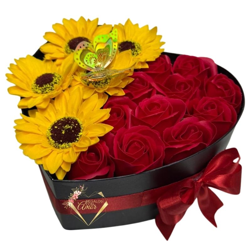 Box Corazón de Rosas Rojas y Girasoles Eternos