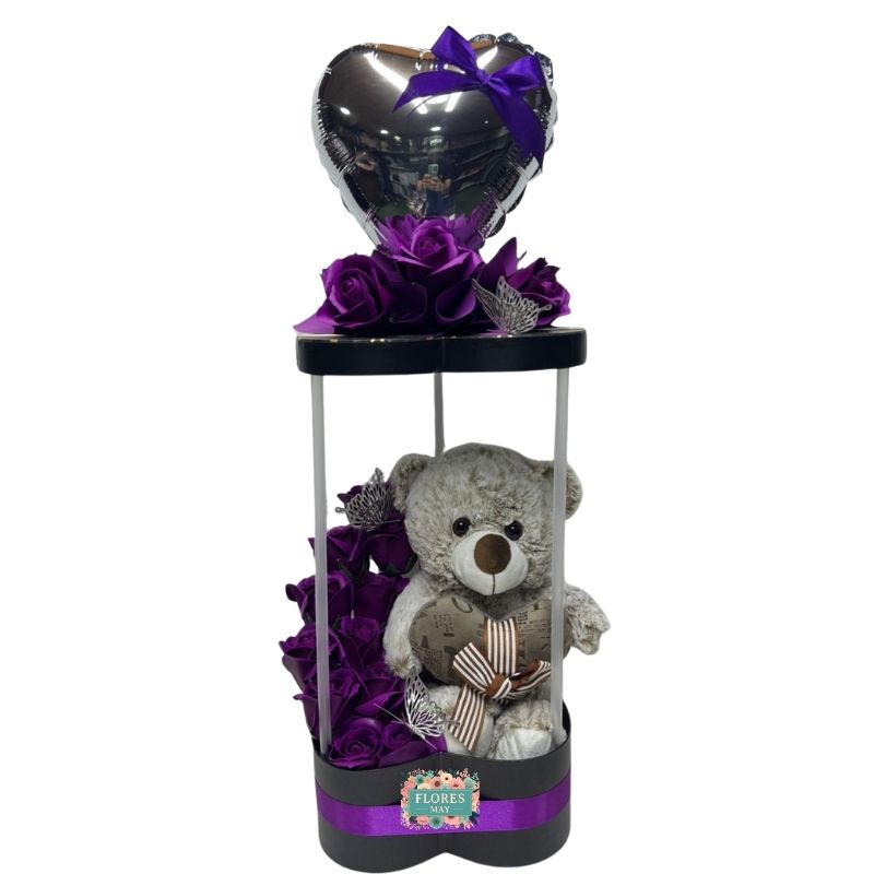 Box Corazón Especial con Rosas Eternas Moradas, Peluche 28cm y Globo