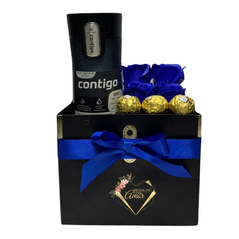 Box Cuadrado con Vaso Térmico Contigo, Rosas Eternas y Bombones