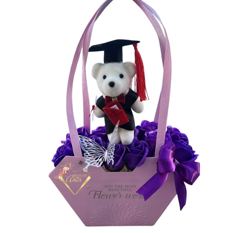 Cartera Hexagonal de Rosas Eternas Moradas y Peluchito de Graduación