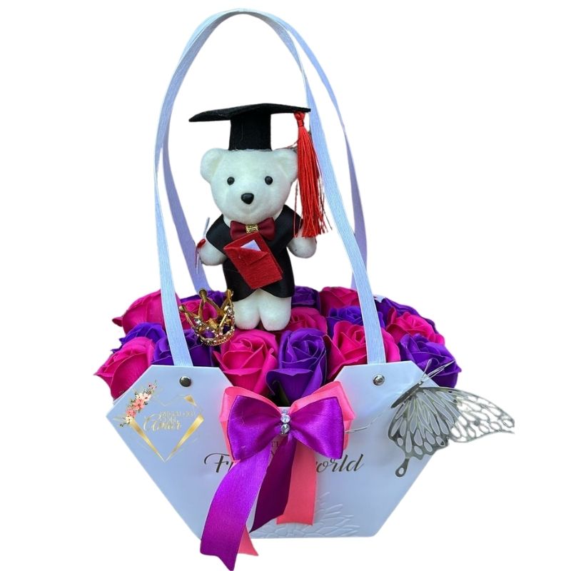 Cartera Hexagonal de Rosas Eternas y Peluchito de Graduación