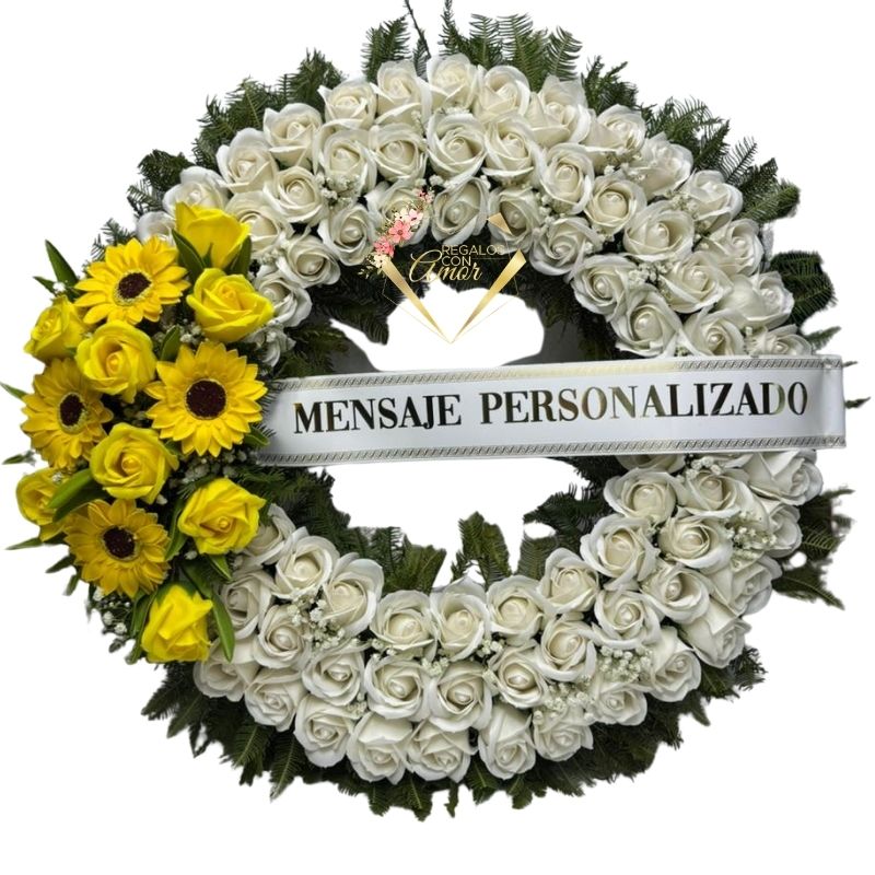 Corona Condolencias de 100 Rosas Eternas, Flores Amarillas, Cinta Personalizada y Atril
