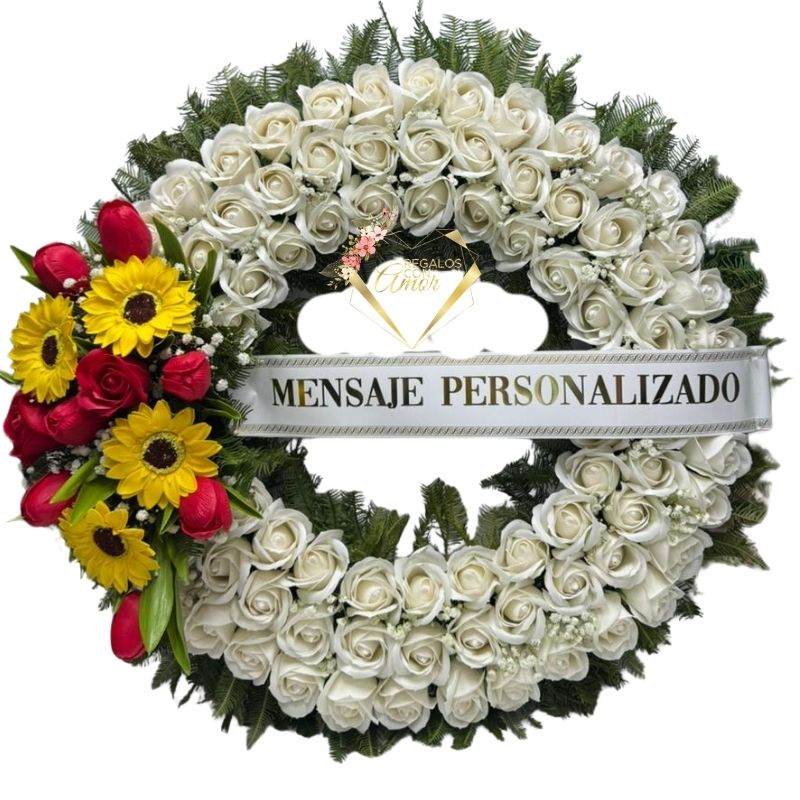 Corona Condolencias de 100 Rosas Eternas, Flores, Cinta Personalizada y Atril
