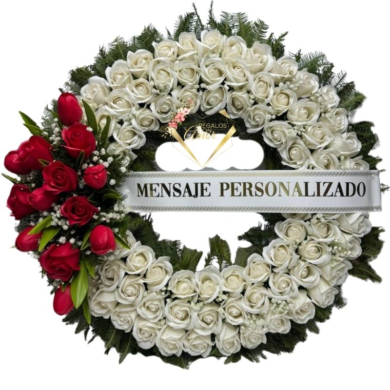 Corona Condolencias de 100 Rosas Eternas, Flores Rojas, Cinta Personalizada y Atril