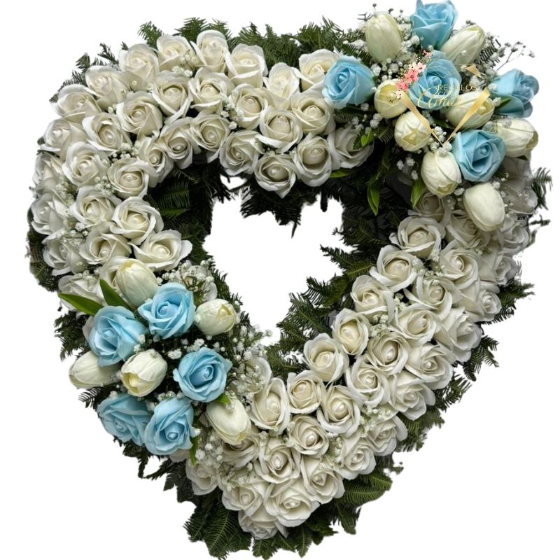 Corona Corazón de Condolencias de 100 Rosas Eternas, Flores Celestes y Atril