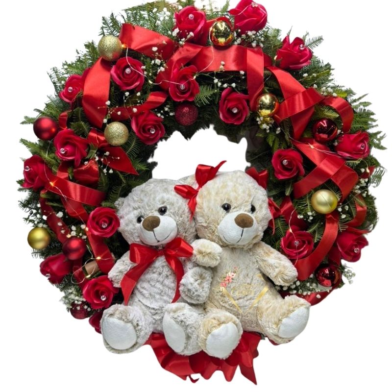 Corona de Navidad con Rosas Eternas y 2 Peluches de 30cm