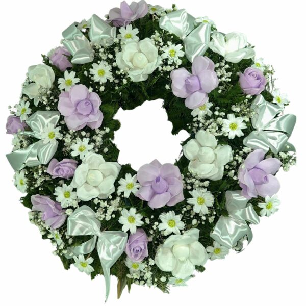 Corona Mediana de Rosas Eternas Blancas y Lilas con Atril