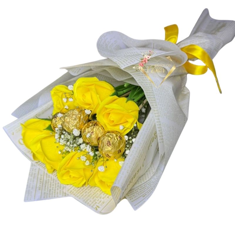 Ramo Alargado de Rosas Eternas Amarillas y Bombones