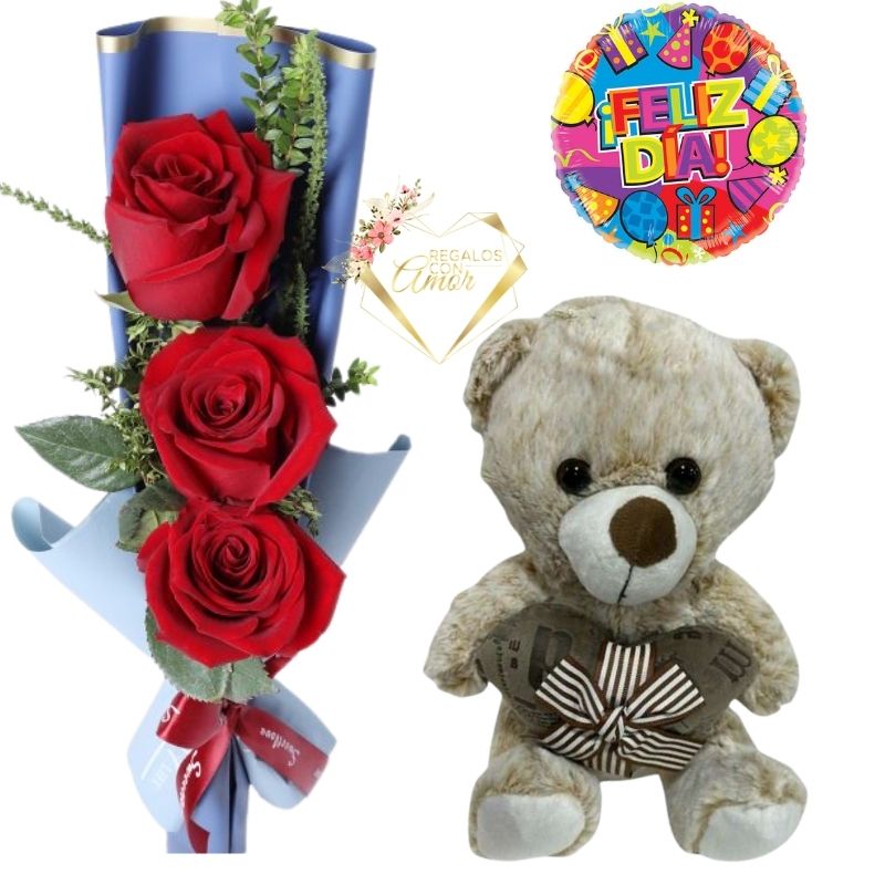 Ramo de 3 Rosas, Peluche Oso 28cm y Globo