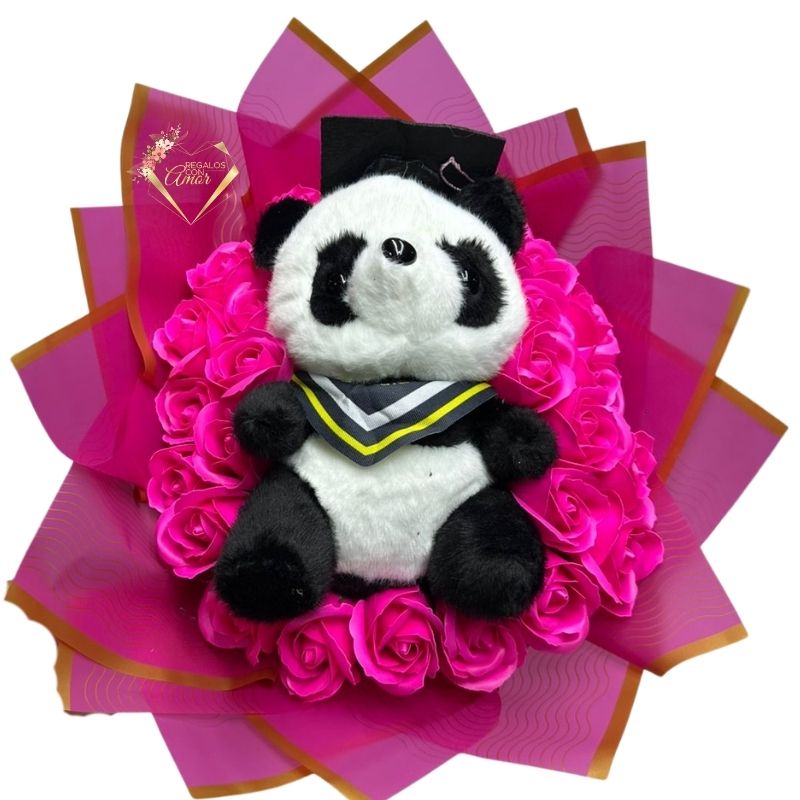Ramo Graduación para Niña con Rosas Eternas Fucsia y Oso 20cm