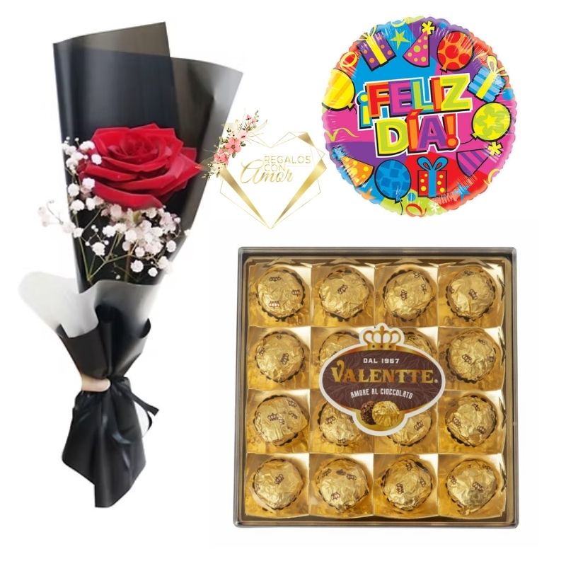 Rosa Decorada, Bombones Valente 200grs y Globo