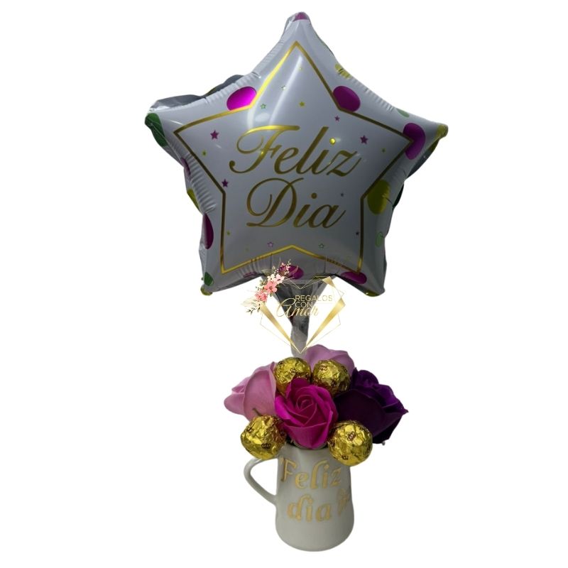 Taza con Rosas Eternas, Bombones y Globito